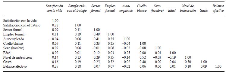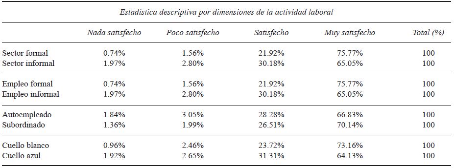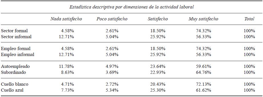 En primer lugar, realizamos un análisis descriptivo de cada una de las variables de interés: sector de empleo, tipo de empleo, relación con los medios de trabajo y tipos de actividad. Relacionamos dichas variables con las variables de control y con las variables dependientes (satisfacción con la vida y con el trabajo). A primera vista, encontramos niveles más altos de educación, ingresos, satisfacción con la vida y satisfacción con el trabajo en estos cuatro grupos: trabajadores dentro del sector formal, empleados formales, subordinados y trabajadores de cuello blanco (cuadros 1, 2 y 3).