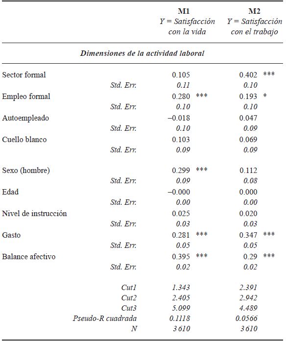 Los resultados anteriores indican que la formalidad, desde ambos enfoques, el legal-empresarial (sector de empleo) y el laboral (tipo de empleo), aumenta significativamente la probabilidad de los individuos de posicionarse en los niveles más altos de bienestar subjetivo; tanto el correspondiente a la satisfacción con la vida, como el correspondiente a la satisfacción con el trabajo. Por el contrario, los datos con los que trabajamos no aportan evidencia de relación significativa entre el tipo de ocupación de las personas o de su relación con los medios de trabajo y su bienestar subjetivo.