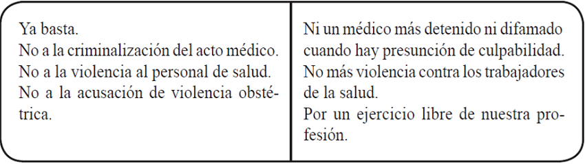 La VE es ejercida por actores que no están en la lucha por las posiciones dominantes del campo médico, ni por subvertir sus reglas en favor de sus intereses; son actores que, con su proceder, desafían reglas sociales de orden más general (i.e. el respeto a la integridad de las demás personas), o bien que buscan hacer valer las reglas de su propio campo dentro del campo médico. En este último caso, se trata de actuaciones (acciones policiacas o demandas legales, órdenes de aprehensión, juicios, sentencias, etc.) que son vividas por igual como actos violentos por los actores del campo médico y que por eso incluimos en este trabajo. El recuadro 1 reproduce el texto de dos pancartas del paro nacional de junio de 2016 (Quadratín Veracruz, 2016); en ellas se aprecia que los médicos perciben como violencia la “criminalización”, las acusaciones, la detención judicial y la difamación.