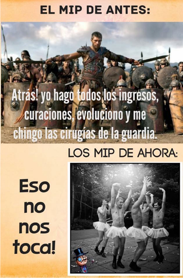 Nuestro trabajo de campo muestra que, al presentar denuncias de VIH, los estudiantes adquieren reputación de “débiles” o “flojos” que “no aguantan” el proceso de formación. Esta narrativa esgrime que esos estudiantes no tenían “la vocación” necesaria para ser médicos. La ilustración 1 muestra un meme obtenido de Facebook que ejemplifica la construcción de narrativas distorsionadoras. Con una clara connotación de género, se muestra como “bailarinas” a los internos “de ahora” que demandan un trato digno durante su formación profesional, y se les compara con internos “de antes” que combatían “como guerreros” sin protestar.