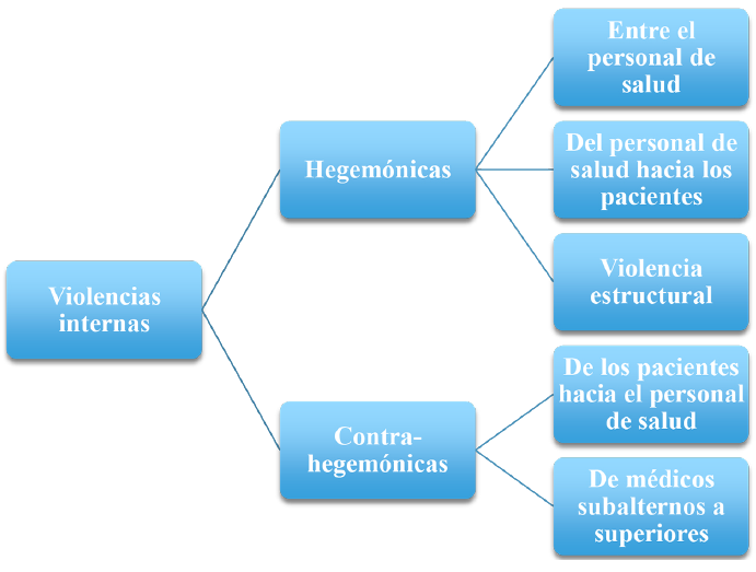 La violencia interna se ejerce entre actores del campo médico, incluyendo al personal de salud (estudiantes, médicos, personal de enfermería, entre otros) y los pacientes. Dichos actores ocupan distintas posiciones de poder en el campo médico, el cual está estructurado tanto simbólica como materialmente. La estructuración simbólica se refleja en las jerarquías establecidas en función de criterios como el prestigio de la especialidad médica de los actores, el prestigio de la institución donde trabajan (tiene mucho más peso simbólico ser subespecialista en el Instituto Nacional de Nutrición que en un hospital de zona del imss), y el turno en el que se labora (el médico del turno matutino es más “importante” que el del turno vespertino y el nocturno). La estructuración material del campo se da a través de la organización de las instituciones médicas mediante claras líneas de autoridad y sigue dos ejes simultáneamente: el académico y el administrativo.