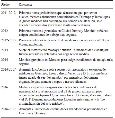En 2011 los medios de comunicación empezaron a dar cobertura a la violencia que afecta al gremio médico en México. Inicialmente se reportó que los médicos abandonaban las comunidades rurales por miedo a ser víctimas del crimen organizado (Blanco, 2011; Imagen Noticias, 2012). Asimismo, se organizaron las primeras marchas gremiales en Morelos y Ciudad Juárez para exigir condiciones de trabajo más seguras (Azteca Noticias, 2012; Morelos & Santos, 2012). Desde 2012 cobró notoriedad la inseguridad de muchos estudiantes de medicina durante su servicio social, en particular a partir del asesinato de varios médicos en comunidades rurales (Santana, 2013; Estrada, 2016). En 2014 surgió el movimiento #yosoy17, en respuesta a una demanda por negligencia médica que derivó en la detención de 16 médicos (Aristegui Noticias, 2014; Excélsior, 2014). Paralelamente, hubo más marchas gremiales y aumentaron las noticias de secuestros, asesinatos y extorsión de médicos (Azteca Noticias, 2014; Televisa, 2017). Finalmente, esta inconformidad del gremio culminó en un paro nacional organizado por #yosoy17 en junio de 2016, que buscaba denunciar las agresiones que sufre el personal de salud, y exigir un alto a la “criminalización del acto médico” (Quadratín Veracruz, 2016).