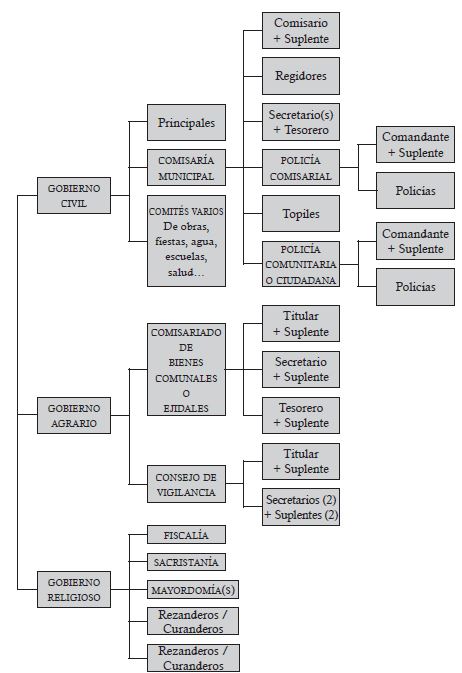 En la Costa Chica de Guerrero los sistemas comunitarios de gobierno presentan una composición tripartita: el gobierno civil, el agrario y el religioso (véase el organigrama), que se repite en toda la región con pequeñas variantes de un municipio a otro, como se observa en los dos peritajes antropológicos que recientemente se hicieron en la región, tanto en San Luis Acatlán (Sierra, y López, 2013) como en Ayutla (Nicasio y Torres, 2015). Cada orden de gobierno articula su funcionamiento en torno a los símbolos físicos de su existencia: el edificio de la comisaría municipal para el gobierno civil; la oficina del comisariado para el agrario; y la iglesia, las estatuas de los santos y los sitios sagrados para el religioso. Al mismo tiempo, los tres están interrelacionados, al depender uno del otro y operar todos bajo un denominador común de grandes principios, orientadores de unas prácticas compartidas.