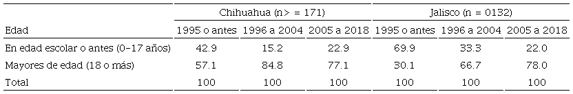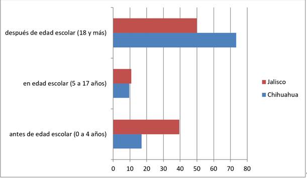 La edad que los migrantes internacionales tenían al llegar a México es un dato del mayor interés para nuestros propósitos. Si los migrantes arriban cuando están todavía en edad escolar (o antes) se puede medir si la migración de un país a otro provocó o no la interrupción de la escolaridad. En la gráfica 1 se observa que alrededor de la cuarta parte de los migrantes internacionales de Chihuahua arribaron a México antes de cumplir l8 años, y es el caso de la mitad de los migrantes internacionales que residen en Jalisco. En este último estado, es interesante notar que más de la tercera parte de los migrantes llegó a México prácticamente cuando estaban recién nacidos (un año o menos de edad). Al respecto, vale pena insistir en que aun si el individuo llegó a México cuando tenía meses de nacido (en Estados Unidos), para los propósitos de nuestro trabajo es considerado como un migrante internacional porque se movió de un país al otro con las consecuencias observadas en la historia de Gustavo, quien llegó a Guadalajara cuando tenía un año.