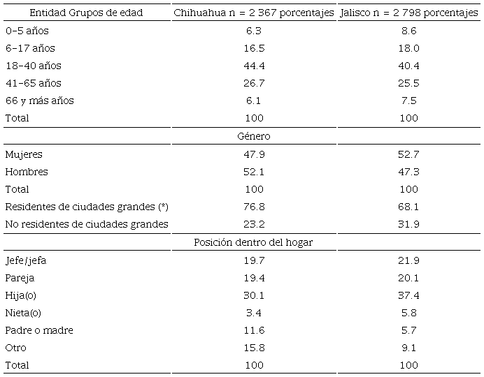 Para obtener las muestras de cada estado, se optó por un procedimiento probabilístico (selección aleatoria de las AGEB),11 estratificado (asegurando la selección de AGEB urbanas y rurales), polietápico (en tres etapas: selección de las AGEB, luego de manzanas y finalmente de viviendas). De esta manera, en cada entidad se encuestaron efectivamente 800 viviendas con un nivel de precisión del +/- 3% para cada estado, y un nivel de confianza de 95%. La base de datos resultante de la encuesta en Chihuahua incluye información sobre 2 367 individuos; la de Jalisco, sobre 2 798.
