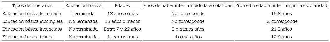 Para adoptar la perspectiva sugerida por el autor, decidimos combinar, para los propósitos de este artículo, cuatro variables relacionadas con la trayectoria escolar de cada uno de los miembros del hogar: escolaridad máxima alcanzada, edad en el momento de la encuesta, interrupción de la escolaridad y, en su caso, edad en la que dejaron de estudiar. Además, para el caso de los migrantes internacionales, se consideró la edad en la que llegaron a México y el país de nacimiento. Estas variables nos permiten responder a la pregunta de investigación que nos planteamos sobre el truncamiento de la educación básica y su relación con la migración de Estados Unidos a México. Al tiempo, la combinación de las primeras cuatro dio lugar a una tipología de itinerarios escolares en las siguientes categorías: