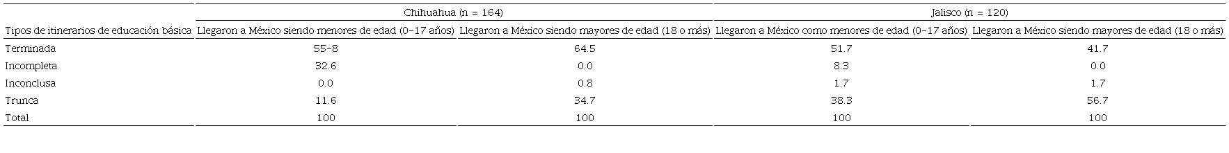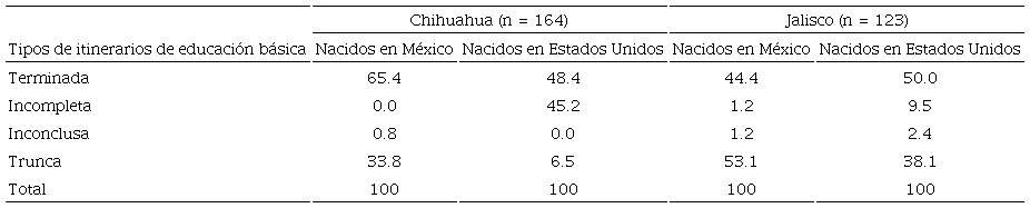 En Chihuahua, como ya lo señalamos, el arribo de los migrantes es más reciente y son más jóvenes (edad en el momento de la encuesta) que los de Jalisco. A su vez, los que han estado llegando últimamente son menores de edad nacidos en Estados Unidos. Esto explica por qué la proporción de nacidos en Estados Unidos clasificados en la categoría de “educación básica trunca” es tan pequeña. Lo que sucede es que la mayoría de los nacidos en Estados Unidos está en las categorías de “educación básica incompleta” o “terminada”. Aun los nacidos en Estados Unidos y clasificados en “educación básica terminada” son relativamente jóvenes, porque tienen un promedio de edad de 28.4 años, contra 41.6 de los nacidos en México (con educación básica terminada). En términos de los propósitos de nuestra investigación, concluimos lo siguiente: en Chihuahua, dada la composición de la muestra, aún no podemos saber si la llegada a México, en edad escolar o antes de la edad escolar, será un factor de exclusión escolar; es decir, no sabemos si ese 45.2% de niños y jóvenes, nacidos en Estados Unidos, inscritos en preescolar, primaria o secundaria en las escuelas del estado, terminarán la educación básica o no.