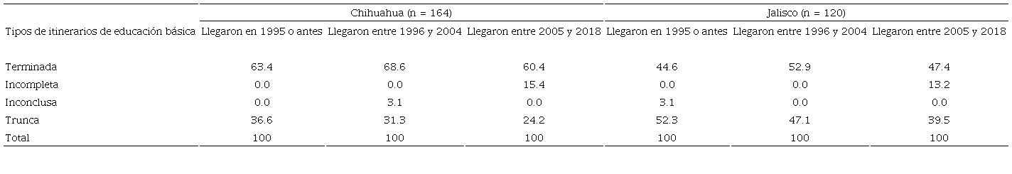 La información que ofrece el cuadro 5 apunta a que la interrupción definitiva de la escolaridad básica se produjo en los tres momentos descritos en el párrafo anterior. En Chihuahua, entre quienes llegaron a México siendo menores de edad, más de la mitad terminó la educación básica; la tercera parte la estaba estudiando en el momento de la encuesta, y solamente 11% fue clasificado con escolaridad básica trunca. Recordemos que los migrantes llegaron a Chihuahua en el periodo más reciente, por esa razón casi la tercera parte estaba estudiando preescolar, primaria o secundaria en el momento de la encuesta. Por el contrario, en Jalisco, donde la mitad de los migrantes de la muestra llegó a México antes de 1986, el porcentaje de los que estaban estudiando en la escolaridad básica es igual a cero, mientras que el porcentaje de los que truncaron dicha escolaridad es mucho mayor (más de la mitad de los que llegaron en ese periodo) (véase cuadro 6).