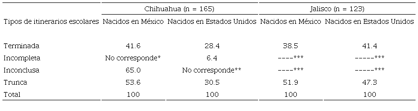 Nos queda por despejar una duda: la relativa a si el país de nacimiento de los migrantes internacionales tiene alguna relación con los itinerarios escolares. Lo que arroja la comparación que presentamos en el cuadro 7 es que las características de la migración de Estados Unidos a México en Chihuahua y en Jalisco influyen de manera clara en el resultado.