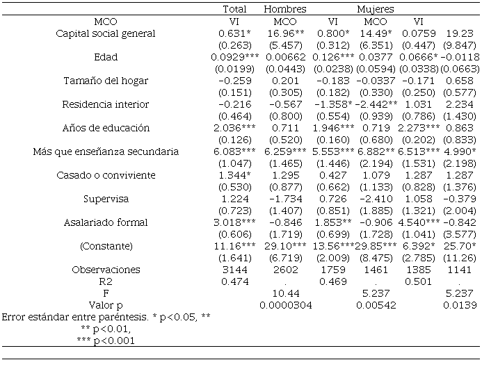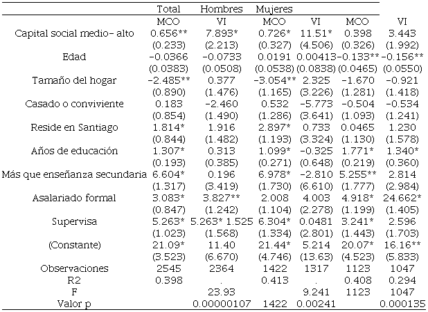 Los modelos para Chile muestran un efecto positivo y significativo del capital social medio-alto, para toda la muestra y los hombres, los cuales se incrementan después de la instrumentación. Con excepción del estado civil y la edad, las restantes variables de control muestran efectos positivos y significativos. El modelo con variables instrumentales mantiene la significación del capital social medio-alto y la condición de asalariado formal.