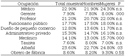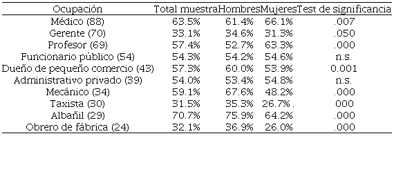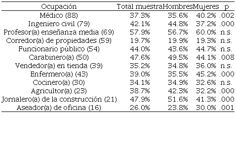 La ocupación con el más alto nivel de contacto en Uruguay es albañil (70.7%), seguida por médico (63.5%). Los hombres aparecen con niveles más altos de contacto que las mujeres en todas las categorías, con excepción de los médicos. Las pautas son marcadamente diferentes a las chilenas. En particular, las diferencias entre sexos no parecen estar condicionadas por los roles de género.