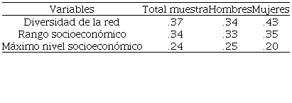 En la muestra total para Chile, el primer autovalor para el capital social general recoge 89% de la varianza total. La correlación de las variables con el factor es clara pero moderada, con valores semejantes para las tres variables. En los hombres, la estructura es similar, pues el primer factor da cuenta de 89% de la varianza. La correlación con las variables observadas es clara pero moderada. Similar estructura se observa en la submuestra de mujeres, con el primer factor recogiendo 88% de la varianza. Lo anterior apoya la decisión de usar el mismo puntaje factorial para hombres y mujeres.