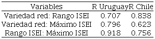 Las correlaciones entre los indicadores de capital social son positivas y fuertes, pues comprenden un rango de 0.707 y 0.918 para Uruguay. Algo similar ocurre en Chile, que fluctúa entre 0.623 y 0.838. Las correlaciones más altas en Uruguay corresponden a las medidas de rango y máximo, mientras que en Chile corresponden a variedad y rango. En Uruguay, la heterogeneidad se incrementa entre quienes tienen acceso a posiciones de alta jerarquía, mientras que en Chile la heterogeneidad de la red depende de la cantidad de posiciones a las cuales ego tiene acceso. Según se aprecia en Uruguay, existe alta probabilidad de que los respondientes tengan acceso a posiciones medias y bajas, pero también al médico, ocupación que incrementa la heterogeneidad de la red.