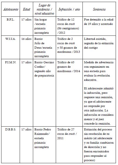 En general, el sistema penal brasileño refuerza las desigualdades sociales (Hulsman, 2009; Hulsman, & Celis, 1993), lo que bloquea los recursos profesionales que podrían dirigirse a la resolución de crímenes o infracciones de carácter violento. Casi todos los procesos entre 2011 y 2014, en los tribunales de Petrolina, se iniciaron contra adolescentes que portaban cantidades muy pequeñas de psicoactivos ilícitos en zonas urbanas periféricas. Otros estudios muestran que esta práctica no es aislada en los tribunales brasileños (Campos, & Alvarez, 2017; Boiteux, 2015). Estos adolescentes no tienen sus derechos garantizados en los procesos judiciales debido al sistema penal, que se coordina con el rudimentario discurso público sobre la guerra contra las drogas, en la falsa polarización entre crimen y sociedad, criminal y trabajador, legal e ilegal (Malvasi, 2012, p. 244).