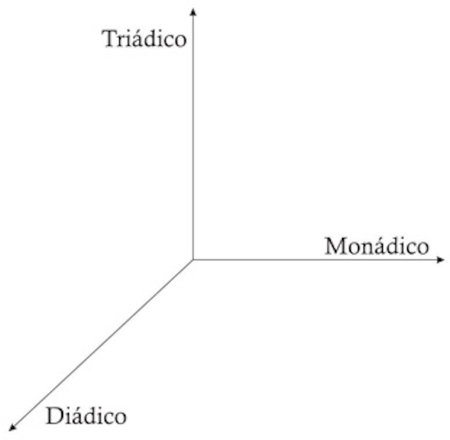 eje triádico: la unidad de esta dimensión es la propiedad social atribuida a un término tercero (tertium) situado en posición citerior o ulterior respecto de entidades individuales y constelaciones ego/alter ego, atribuyéndosele capacidad/es para organizarlos socialmente.14