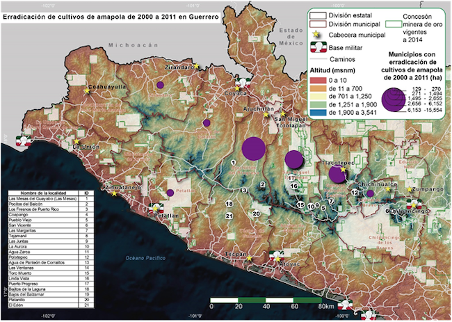 La población de la Sierra también tiene orígenes étnicos y culturales muy diversos, pues se encuentra en el corazón de todas las regiones oficiales de Guerrero (Mapa 1). Sin embargo, algo que todas las comunidades comparten en mayor o menor medida es una combinación entre miseria y aislamiento geopolítico que fue el terreno propicio para el arraigo del cultivo de estupefacientes: primero la mariguana y después la amapola. Se ha documentado que el cultivo de amapola a gran escala llegó a Guerrero de la mano de la contrainsurgencia (Estrada, 2015), a través de militares aliados con jefes del Cartel de Jalisco (Padgett, 2015), en momentos en que los cultivos ilegales en el Triángulo Dorado (la frontera compartida entre Sinaloa, Durango y Chihuahua) eran erradicados y los productores severamente perseguidos mediante la llamada Operación Cóndor (Enciso, 2009; Fernández, 2018).