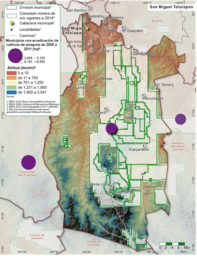 Una parte de esos territorios se halla en el llamado Cinturón de Oro de Guerrero, en un contexto mundial en que la minería es devastadora para el medio ambiente: para extraer la mayor cantidad posible de minerales, la maquinaria destruye la superficie y contamina los mantos acuíferos, volviendo los territorios inhabitables (Gómez, 2020; “Así se ve la minería en México, 2020). No obstante, muchos de esos territorios también son productores de goma de opio: ocurre entonces una yuxtaposición de intereses sobre un mismo territorio y la confrontación de conglomerados de poder cuyas alianzas son inestables (Zagato, 2018), y una constante transformación y adaptación de los grupos criminales en relación con las cambiantes condiciones para la extracción de ganancias.