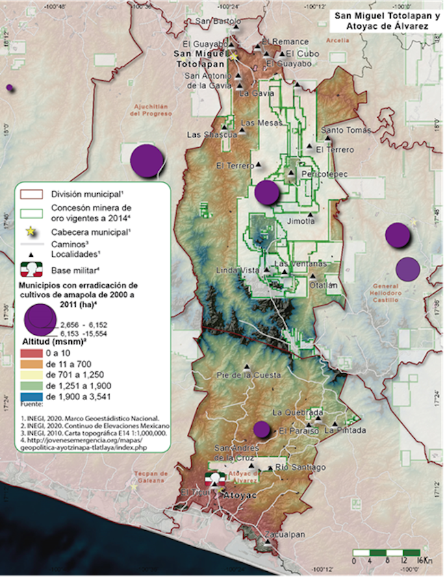 La serranía que comparten Atoyac y San Miguel Totolapan (Mapa 3) se caracteriza por ser de difícil acceso, tener profundos rezagos sociales, por lo cual no es sorprendente que desde la década de 1970 se expandiera el cultivo de la amapola y la producción de la goma de opio (Ospina; Hernández, & Selsma, 2018), que en la Sierra floreció al amparo de la alianza entre militares y políticos-empresarios locales (principalmente agrupados en asociaciones ganaderas) (Flores, 2018c), quienes mantenían una relación de reciprocidad asimétrica -y desfavorable- con los productores.