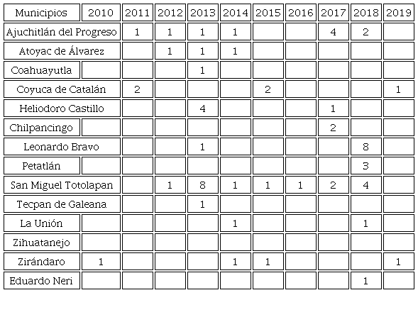 Tal atomización coincide con un incremento de los homicidios, secuestros, extorsiones y desapariciones en la entidad, principalmente entre 2007 y 2017 (Pantoja, 2018). Las dinámicas de violencia en las distintas regiones de Guerrero no son homogéneas, se transforman a lo largo del tiempo, y la acción de agentes estatales también es heterogénea: a veces contraria a ciertos grupos delictivos, otras en franca complicidad y constantemente omisa para proteger a comunidades campesinas. Se configura así un panorama de aguda incertidumbre y precariedad de las condiciones de seguridad de la población, donde es común que surjan grupos de civiles armados como mecanismos de autodefensa comunitaria o milicias privadas: un estado de guerra irregular y no convencional (Illades, & Santiago, 2014), cuya invisibilidad es el propio sello de la relación Estado-comunidades (Serje, 2005).