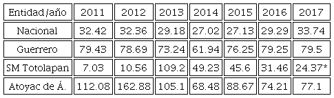 Estos últimos fueron sustituidos en Atoyac por gente al servicio del Cartel de Sinaloa, desde 2006 hasta 2009, cuando la ruptura entre los Beltrán Leyva y Sinaloa supuso la confrontación de grupos aliados y con influencia en la Costa Grande de Guerrero asentados en Tecpán de Galeana (Flores, 2017), e incrementó la violencia en Atoyac, que entre 2011 y 2017 arrojó tasas de homicidios ampliamente superiores a las del estado, que ya eran característicamente más altas que las nacionales (Tabla 2).
