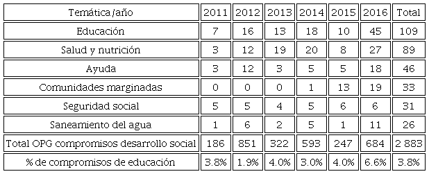 En términos sectoriales, la base de datos de OGP identifica diversas políticas de desarrollo social, donde se incluyen temáticas como educación, salud y nutrición, ayuda social, comunidades marginadas, seguridad social y saneamiento del agua. Como se puede ver en la Tabla 1, la temática de educación representa sólo el 3.8% (N=109) de los 2 883 compromisos de Gobierno Abierto, aunque es la política de desarrollo social con mayor cantidad de compromisos. Se pueden observar variaciones importantes en los años, donde en 2016 hay un incremento absoluto y relativo de compromisos relativos al tema educativo alcanzando el 6.6% de todos los compromisos de Gobierno Abierto asumidos ese año.