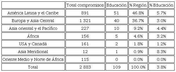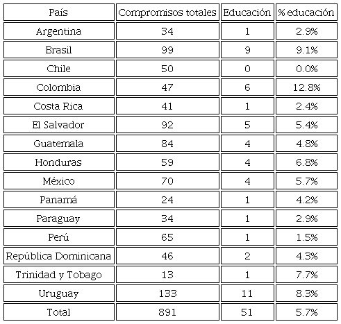 Al revisar en profundidad la región latinoamericana, a pesar de ser la región con mayor cantidad de compromisos educativos, se advierte una proporción muy reducida de compromisos relacionados con la educación (Tabla 4).