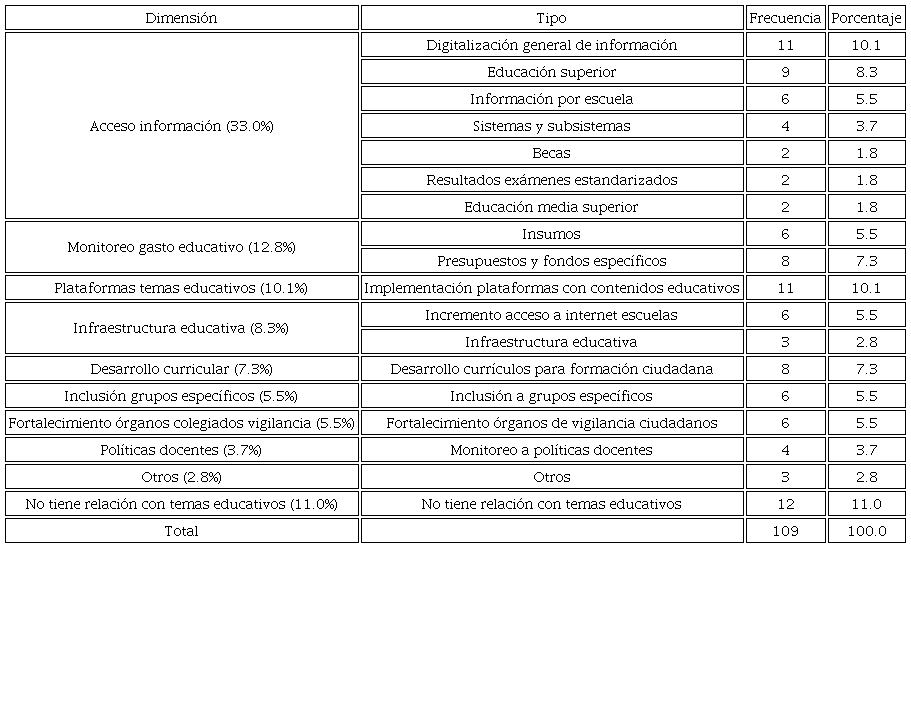 Este análisis permitió la construcción de una tipología de acciones propuestas en los compromisos. Esta tipología se compone de nueve categorías: 1) ampliar el acceso de información educativa por internet; 2) generar procesos de monitoreo y seguimiento de gasto educativo; 3)desarrollar plataformas en internet para facilitar el acceso de contenidos educativos; 4) mejorar la infraestructura las escuelas; 5) desarrollar contenidos curriculares respecto a temáticas de formación ciudadana-Gobierno Abierto-transparencia; 6) propuestas para la inclusión de grupos vulnerables; 7) fortalecimiento de órganos colegiados de vigilancia; 8) seguimiento de políticas docentes, y una categoría de 9) “otros”.