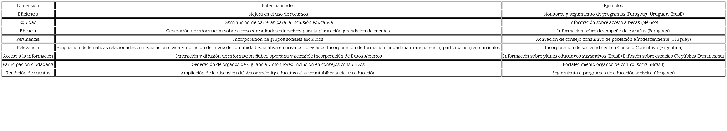Respecto de las potencialidades, los aportes de la estrategia de GA en educación son dos: 1) fortalece las dimensiones de calidad educativa, y 2) permite generar innovaciones institucionales para abordar los rezagos de sistemas educativos en transparencia, participación y rendición de cuentas. El siguiente cuadro resume las potenciales en cada dimensión.