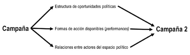 El modelo aquí expuesto tiene por objetivo, pero a la vez exige, no sólo dar cuenta de una campaña de acción colectiva, sino que cuente ésta con repertorios de ADM o no, y aprehender analíticamente el proceso a través del cual transcurre hasta alcanzar campañas siguientes en las que el condicionamiento que produce tiene efectos. A la vez, requiere dar cuenta de las condiciones de posibilidad provistas por campañas anteriores.