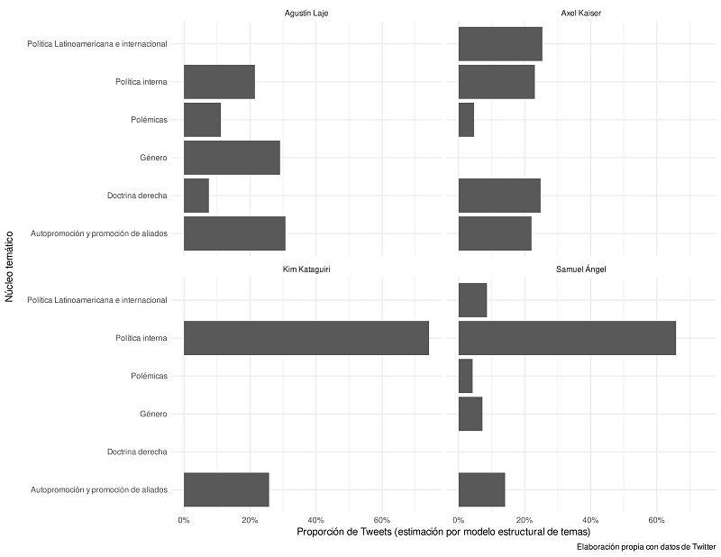 En nuestro análisis de tópicos estructurales hallamos que los influencers concentran su intervención en un número limitado y recurrente de temas (gráfico 1). En efecto, parte de las estrategias digitales tienen que ver con la recurrencia en los temas o en tipos de asuntos que atraen a sus seguidores. Un tópico compartido por los cuatro casos es la autopromoción. Los libros publicados constituyen no sólo clásicos instrumentos de intervención pública, sino también ocasiones para promocionar sus ideas y sus actividades off-line, entre las que destacan charlas y conferencias frente a diferentes auditorios (grupos religiosos y universidades confesionales, pero también espectáculos tipo stand-up en teatros comerciales, como el descrito en la introducción). En el caso de Laje, las referencias a El libro negro de la nueva izquierda ocupan la mayor proporción de tuits en el corpus analizado. También Kaiser promociona sus libros y sus columnas en El Diario Financiero y El Mercurio. Lo mismo puede verse en el caso de Ángel, quien promociona sus charlas en YouTube y sus intervenciones en medios de prensa digitales. En el caso de Kataguiri la autopromoción está más ligada a las actividades y tomas de posición del MBL respecto de temas de coyuntura. En los cuatro casos, la autopromoción se combina con el intento de establecimiento de alianzas que, o bien refuerzan relaciones off-line, o bien sostienen lazos digitales entre influencers, o de los influencers con periodistas e intelectuales conservadores o economistas neoliberales.