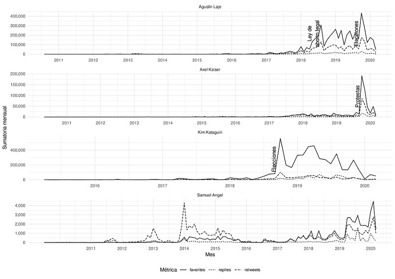 La evidencia sobre la que trabajamos proviene de un estudio cuali-cuantitativo realizado entre 2018 y 2020 acerca de las intervenciones en Twitter -donde están sobrerrepresentados los usuarios interesados en la política- de cuatro influencers latinoamericanos: Agustín Laje (Argentina), Kim Kataguiri (Brasil), Axel Kaiser (Chile) y Samuel Ángel (Colombia). Asimismo, estudiamos a sus seguidores en esa red social. Complementamos este análisis con un seguimiento de la actividad de los influencers en otras redes (Facebook y YouTube), así como de sus actividades off-line y on-line, mayormente por medio de una observación etnográfica digital (Pink et al., 2015).