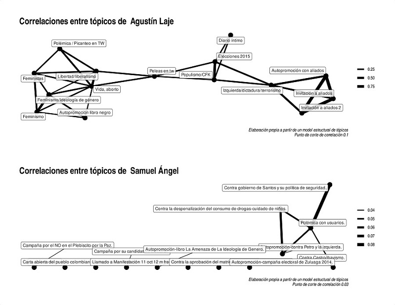 Los estudios sobre influencers de derecha (Lewis, 2020; Maly, 2018; 2020) encuentran que estos actores construyen una identidad digital en la que se enhebran aspectos de su vida personal (pero no íntima), con los avatares de sus carreras y, por supuesto, de sus posiciones públicas. Analizando las estrategias digitales en términos temáticos encontramos un factor que explicaría en parte la disímil notoriedad de los influencers estudiados. Los más exitosos son quienes logran establecer una coordinación entre los diferentes temas sobre los que intervienen. En este caso, se trata de unir la autopromoción, las polémicas y alianzas públicas con otras cuentas de Twitter y la agenda temática que movilizan. En el gráfico 3 podemos ver la correlación entre los tópicos que identificaron los modelos estructurales para los casos del influencer más exitoso (Laje) y del menos exitoso (Ángel). Cada nodo es un tópico y los vértices la correlación entre los mismos. A partir de niveles muy bajos de correlación6 los tópicos quedan separados, desvinculados de los demás. Éste es el caso de Ángel: sólo algunos tópicos están correlacionados y la correlación es en todo caso muy débil. El caso de Laje es exactamente el opuesto: todos los temas están articulados entre sí y las correlaciones son siempre superiores a 0.25.