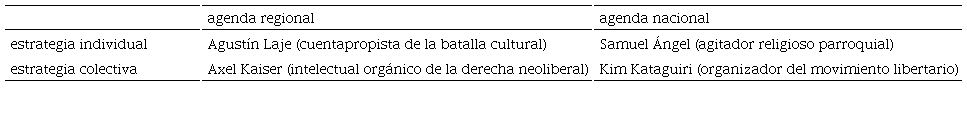 El cuentapropista (o emprendedor) de la batalla cultural está enfocado en ganar visibilidad y seguidores regionales, para lo cual interviene en temas asociados con las preocupaciones más generalizables de la agenda conservadora: cuestiones de género y derechos reproductivos, por un lado, y el combate al populismo/chavismo, por el otro. El intelectual orgánico de la derecha neoliberal, en tanto, sigue esos mismos parámetros, pero se apoya y apoya más abiertamente instituciones y redes de las que forma parte. En consonancia, está enfocado en la agenda económica tanto desde un punto de vista teórico, contra las teorías económicas que defienden el rol del Estado en la economía, como en polémicas coyunturales contra medidas de gobierno, debates legislativos y propuestas económicas de políticos. Aunque pueda aludir tangencialmente a la “batalla cultural”, no es tal su especialidad.