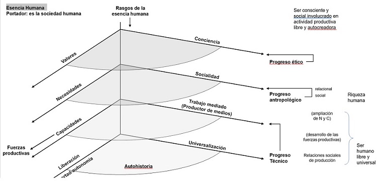 No se trata sólo de que, según él, sea posible hallar ciertos rasgos abstractos que permanecen inmutados en el curso de la configuración histórica de la ‘naturaleza’ de los hombres concretamente reales; sino también que esa ininterrumpida configuración de la “naturaleza humana” es ella misma un proceso unitario que se puede captar y caracterizar en ésa su unidad… Esta precisión nos da en cierto sentido la clave de la comprensión del concepto marxista de ser humano -o esencia humana o naturaleza humana- ante todo aquellos rasgos esenciales de la historia humana real que permiten entender dicha historia como un proceso unitario dotado de una determinada dirección y una determinada tendencia evolutiva. Esta determinada dirección u orientación… está dada por la universalidad y por la libertad del hombre: la caracterización del hombre como un ser social, consciente, que ejecuta una libre actividad de trabajo apunta a los rasgos esenciales necesarios, a las dimensiones del proceso evolutivo global sobre la base de los cuales se despliega aquella tendencia histórica… (pp. 72-73).