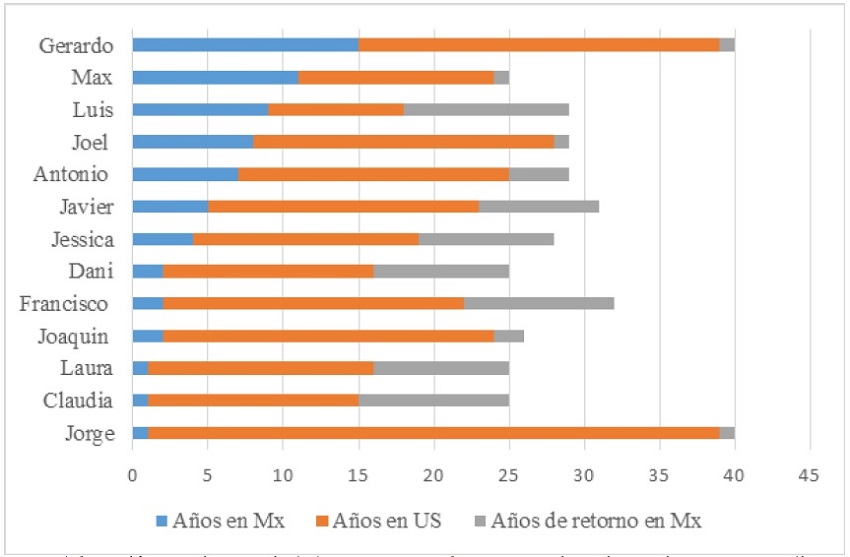 En conjunto, las líneas azul y gris indican el tiempo que cada joven ha vivido en México mientras que la línea naranja nos indica los años en Estados Unidos. Para todos los participantes, la estancia fuera de México representa una parte significativa de sus vidas; Jorge y Gerardo ejemplifican dos casos extremos, pues la mayor parte de su vida ha transcurrido fuera de su país de origen. Estos casos sugieren la pertinencia de utilizar el concepto de integración en lugar de reintegración para describir el proceso que ocurre una vez que vuelven a México. Para el resto de los participantes, la estancia en Estados Unidos representa entre la mitad y una tercera parte de sus vidas hasta ahora. Respecto a sus trayectorias educativas, encontramos que la mayor parte de la escolarización de nuestros participantes ocurrió en Estados Unidos, una característica importante de la generación 1.5: diez jóvenes concluyeron high school, dos tuvieron acceso a community college y uno de ellos terminó un programa universitario de cuatro años en California.
