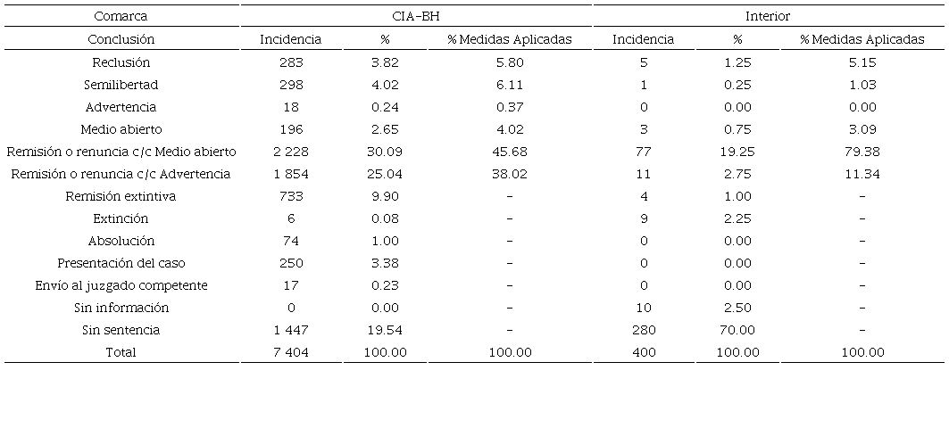 A pesar de que haya ligeramente un mayor porcentaje de medidas privativas de la libertad en Belo Horizonte, se observa una mayor variedad de medidas socioeducativas susceptibles de ser aplicadas que en el Tribunal del interior. Ejemplo de esto es la aplicación de una medida de semilibertad, que es menos gravosa que la de internación y es más utilizada en la capital. El porcentaje general de las medidas en medio abierto también es parecido, pero como en la capital existe una red de infancia y de la juventud más estructurada, existen mayores posibilidades de alternativas que en el interior, como programas para usuarios de drogas y ciclos de justicia restaurativa. Por desgracia, no existe detalle de estas cuestiones en la base de datos analizada, pero dichas alternativas se observaron durante las audiencias asistidas en el CIA-BH.