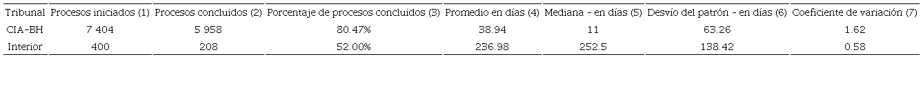 Si en el CIA-BH el promedio de tiempo entre el acto de infracción y el cierre final fue de 11 días, en el Tribunal del interior fue de 252.5 días. En este recorte, el tiempo promedio de los procesos es más de 22 veces menor que en el interior. Además, es probable que al expandirse las fechas límite para la contabilización de estas variables, la proporción aumente todavía más. Evidentemente, esto no quiere decir que el trámite de los procesos sea lento en el Tribunal del interior, pues cuando se comparan los tiempos de procesamiento obtenidos en este Tribunal y en otras modalidades de la justicia criminal con estudios consolidados, el tiempo promedio para las sentencias no es elevado (Ribeiro, Machado, & Silva, 2012). También es probable que los tiempos de procesamiento de los casos obtenidos en el Tribunal del interior no sean superiores a los de otras comarcas del estado. Por el contrario, en función de los mecanismos de coordinación observados en el municipio y de los acuerdos realizados entre los agentes judiciales, se cree que los procesos se tramitan de forman más rápida que en gran parte de los Tribunales tradicionales. Lo que llama más la atención, por lo tanto, es la hiperceleridad en el procesamiento de los actos de infracción en el CIA-BH, lo cual confirma la hipótesis señalada en otros estudios sobre la instantaneidad de este modelo de justicia (Nedel, 2007; Silva, 2014; Marinho, & Vargas, 2015).