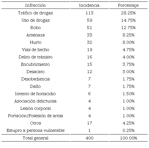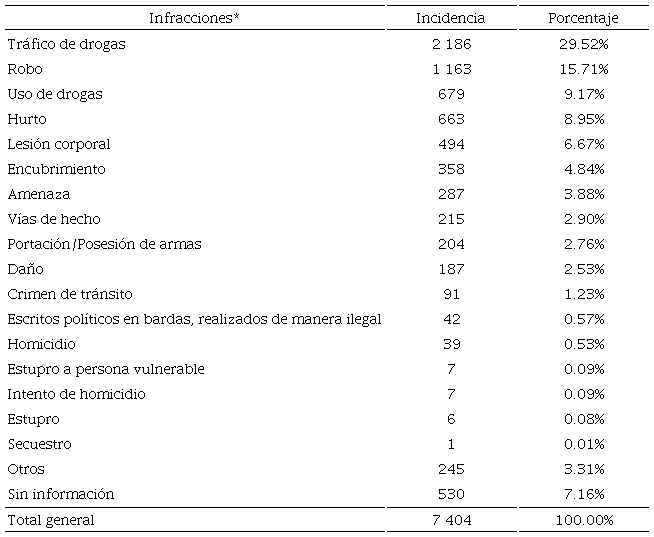 En términos generales, se observó que la composición por género y edad de los adolescentes y los actos de infracción practicados por ellos es muy semejante en las dos comarcas.7 En ambas el porcentaje de chicos es de aproximadamente 89% y de chicas de 11 %. La gran mayoría de los adolescentes en las dos comarcas tienen entre 15 y 17 años, cerca de 84% en la capital y 85% en el interior. Adicionalmente, en las dos localidades el tráfico de drogas es el delito más frecuente, cerca de 30% en Belo Horizonte y 28% en el interior. El robo y el uso de drogas también son comunes, de modo que en el CIA-BH estos actos de infracción representan cerca de 16% y 9%, respectivamente, y en el interior 13% y 15%, respectivamente. Otros delitos de mayor frecuencia en los dos Tribunales son hurto, amenazas, encubrimiento e infracciones de tránsito. En el municipio del interior no se registró ningún caso de homicidio cometido por adolescentes. En Belo Horizonte, el porcentaje de jóvenes acusados de involucrarse en homicidios fue menor al 1 %. Otros actos de infracción graves como estupro, estupro de vulnerable, secuestro e intento de homicidio también tienen frecuencias bastante reducidas en los dos Tribunales, cercanas al 0 %.