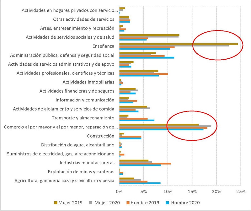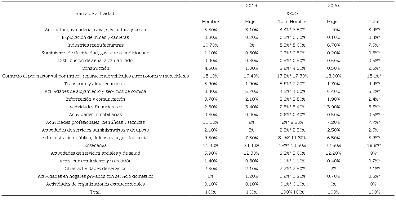 Las actividades con mayor participación laboral de la población femenina para el año 2019 son Enseñanza (24.4%); Comercio, reparación de vehículos automotores y motocicletas (16.4%); Actividades de servicios sociales y de salud (12.3%); Actividades profesionales, científicas y técnicas (8%); y Administración pública, defensa y seguridad social (7.5%). Para el año 2020 se mantiene elevada la participación en la rama Enseñanza, aunque con un porcentaje menor (22.5%); en la rama Comercio, reparación de vehículos automotores y motocicletas se identifica mayor participación que el año anterior (18.9%); en tanto que las ramas de Actividades de servicios sociales y de salud (12.2%) y Actividades profesionales, científicas y técnicas (7.2%) se mantienen con leves variaciones (véase cuadro 2).