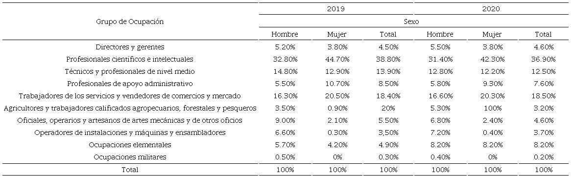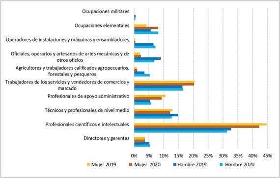 En contraste, las mujeres ocupaban una mayoría representativa en los grupos de profesionales, científicos e intelectuales y profesionales de apoyo administrativo en los dos años; sin embargo, para 2020 la participación de las mujeres decrece en 2.4% en el primer grupo y la participación de hombres crece en 9.5%. En el caso de profesionales de apoyo administrativo, la participación femenina también sufre un impacto negativo a causa de una disminución de 1.4% y el aumento de participación masculina de 0.3%. La única ocupación en la cual aumenta la participación tanto femenina (4%) como masculina (3.5%) es la denominada ocupaciones elementales, la cual hace referencia a actividades por cuenta propia como el trabajo informal (INEC, 2012b).