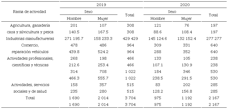 El análisis del Chi cuadrado mostró que entre los grupos comparados existen diferencias significativas por ramas de actividad por sexo. De acuerdo con el coeficiente de contingencia e independencia, los datos arrojaron una asociación estadísticamente significativa = .2. (Sig. .000) de modo que se confirma así que los datos se encuentran relacionados entre las variables. Para el año 2020 se evidenció que también existen diferencias significativas por ramas de actividad por sexo. Además, se encontró una asociación estadísticamente significativa de = 0.26 (Sig. .000), lo cual confirma así que los datos están relacionados entre las variables. De manera referencial se deduce que, tanto para el año 2019 como para el 2020 se registraron diferencias significativas por ramas de actividad por sexo (véase cuadro 3).