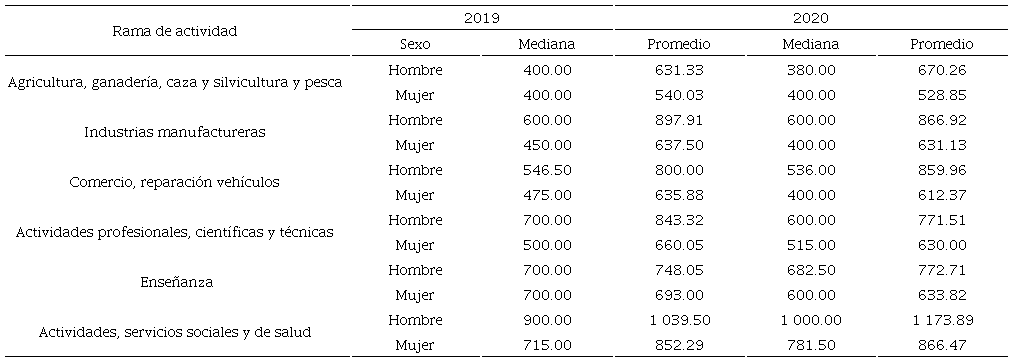 En el cuadro 4 se analizan las ramas de actividad por sexo y por el nivel de ingreso. Al analizar el ingreso por las ramas que cuentan con mayor representatividad se encuentra lo siguiente. En la rama de actividad de Comercio y reparación vehículos, el promedio de ingresos para las mujeres fue de 800.00 USD y para los hombres de 546.5 USD en el año 2019; en 2020 fue para las mujeres de 400.00 USD y para los hombres de 635.88 USD. Respecto a la rama de actividades Profesionales, científicas y técnicas, el promedio de ingresos en 2019 para las mujeres fue de 660.05 USD y para los hombres de 843.32 USD; en el 2020 el ingreso promedio para las mujeres fue de 515.00 USD y para los hombres de 600.00 USD. En cuanto a la rama Enseñanza, el promedio de ingresos para las mujeres fue de 748.05 USD y para los hombres de 748.05 USD en el año 2019; en 2020 para las mujeres fue de 600.00 USD y para los hombres de 682.50 USD. Con esto, se hace patente la diferencia salarial entre mujeres y hombres en las ramas de actividad, ya que la población femenina es la menos favorecida y más impactada en el año 2020.