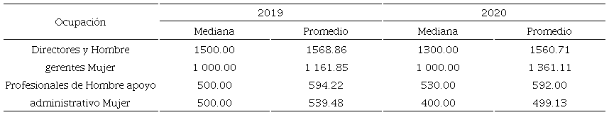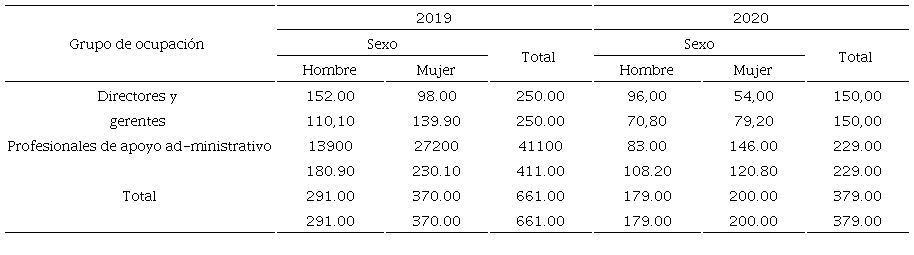 Para contrastar la hipótesis teórica sobre la segregación vertical de las mujeres profesionales, se procedió a analizar la ocupación de directores y gerentes en 2019 y 2020. Por sexo, la concentración ocupacional es masculina los dos años. En 2019, la participación de los hombres alcanzó el 5.2% y en 2020 ascendió a 5.5%, es decir, un incremento de 0.3%. En contraste, la participación de las mujeres se mantuvo en 3.8%. En resumen, para el 2019 de cada 100 hombres, 5 trabajaban como directores / gerentes, y en el 2020, 6 de cada 100; mientras que las mujeres llegaron a 4 elementos.