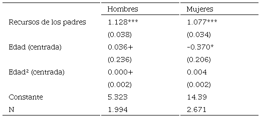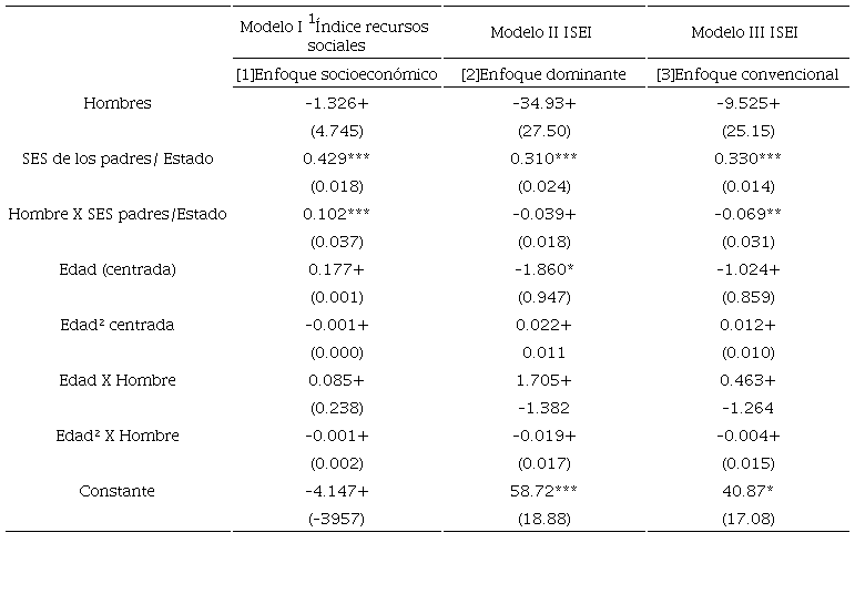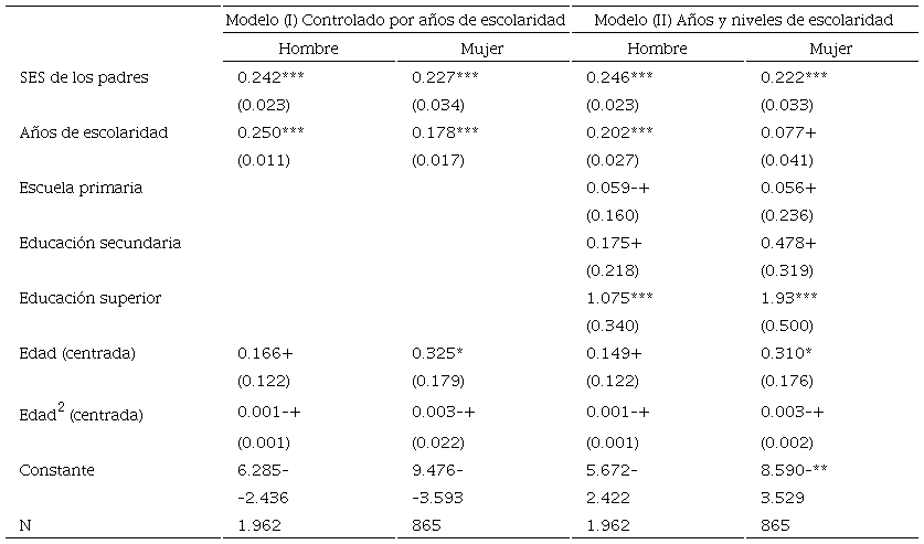 La forma en que los datos se agruparon en la regresión lineal permite mostrar una intercepción e inclinación diferentes para cada predictor, cabe destacar que esta formulación es equivalente a ejecutar dos regresiones separadas por “género”, como afirmó Torche (2015a). La diferencia de género en las intercepciones es dada por el parámetro estimado para la variable binaria “género” cuyo valor es uno. Este tipo de análisis es semejante a realizar dos regresiones, una para las mujeres y otra para los hombres. Esta operación es la que permite tomar los valores de los maridos y de sus esposas y no del agregado familiar en este momento. La diferencia en la persistencia es reconocida por la interacción entre la variable interactiva (hombre) multiplicada por el SES de los padres (índice de recursos y estatus ocupacional)5 por la medida continua de la posición socioeconómica del domicilio (SES de los padres, modelo I, y estatus ocupacional de los padres, modelos II y III).