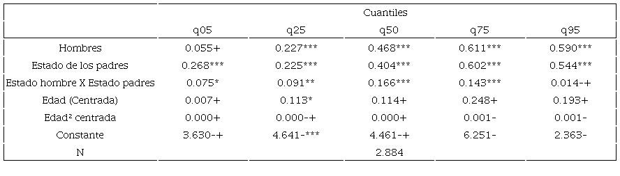 La regresión cuantílica (RQ) examina de manera pormenorizada la diferencia en el patrón de movilidad social de género de la asociación intergeneracional en varios percentiles condicionales de SES de los jefes/hijos, lo que incluye el 5º, 25º, 50º, 75º y 95º percentil de la condición; la tabla II ofrece estimaciones de parámetros y errores patrón (Torsche, 2015a). Conforme indica Jäntti et al. (2006), es posible que dos grupos tengan persistencia media similar (medida por la asociación lineal), y que un grupo tenga mayor propensión a la movilidad con base en esta media. El grupo con mayor variabilidad en torno a la media puede observarse como que tiene mayor movilidad (Torsche, 2015). Aunque sea un constructo biológico, la hipótesis Trivers-Willard propone que en determinados contextos los padres podrían favorecer a los hijos en detrimento de las hijas (Hedges et al., 2016). Por eso se estimaron modelos de regresión por cuantiles para estimar que los valores distantes de la media sean los más bajos o los más altos, cada cuantil representa un estrato social, donde el 5º es el más bajo y el 95º el más alto, el valor 50º es la mediana, la media se estima a partir de la regresión lineal (OLS) de la tabla 2. Se estimaron modelos de regresión cuantílica que condicionan la edad y su cuadrado, como términos interactivos, como en la regresión anterior (tabla I). Probamos las siguientes hipótesis en la tabla 2: hipótesis I, los padres ricos favorecen a los hijos, mientras que los padres de las familias de clase media favorecen a las hijas, hipótesis II, Trivers (1972).