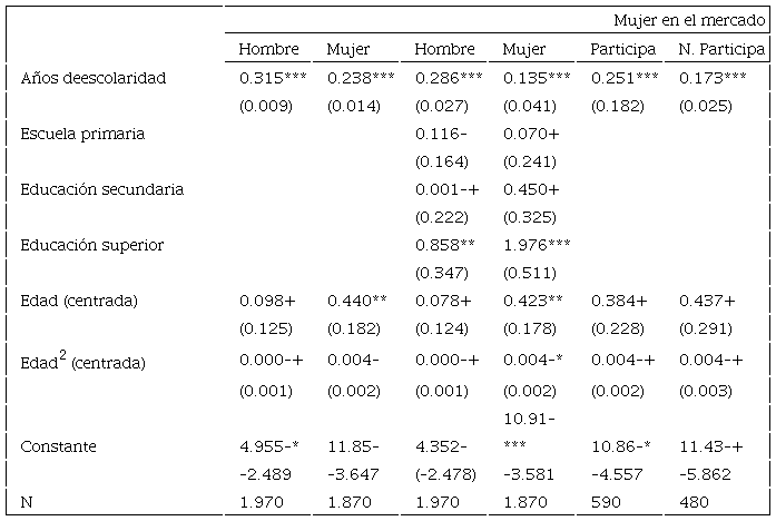 Cabe subrayar que las mujeres con educación elevada tienden a casarse con hombres que también poseen educación elevada, lo que tendrá como resultado que la escolaridad de las mujeres sea elevada independientemente de participar en el mercado de trabajo, debido a la tendencia a la homogamia educacional (Torsche, 2015a). Para probar esta hipótesis, la muestra fue estratificada en: mano de obra femenina que participa en el mercado y por la parte de este contingente que no se encuentra en la fuerza de trabajo (modelo III en la tabla 3B). Los resultados indican que los retornos a la escolaridad son menos entre las mujeres que no trabajan, las estimaciones de los parámetros son de 0.251 para las mujeres en la fuerza de trabajo y 0.173 para las mujeres no empleadas en el momento de la entrevista, en un intervalo de confianza de [P>0.001], lo que indica la importancia de la contribución de la mujer en los hogares brasileños.