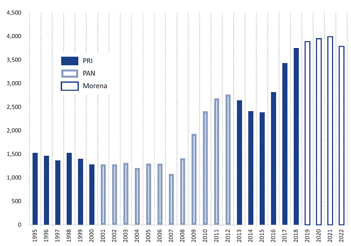 Aunque podríamos esperar que los partidos de izquierda como Morena estén más comprometidos en esfuerzos para promover la igualdad de género, los partidos de derecha como el PAN han promovido frecuentemente políticas de mano dura, las cuales pueden reducir las tasas de homicidio de manera más generalizada. Como argumenta Holland (2013), un enfoque en el estado de derecho permite a los partidos conservadores desarrollar vínculos programáticos a través de divisiones de clase. Y los partidos conservadores a menudo se basan en mitos sobre su capacidad para proporcionar una mayor seguridad pública (Willis-Otero, 2014), mientras que la izquierda ha resistido a menudo las políticas antidelincuenciales en un esfuerzo por defender los derechos humanos (Yashar, 2011).