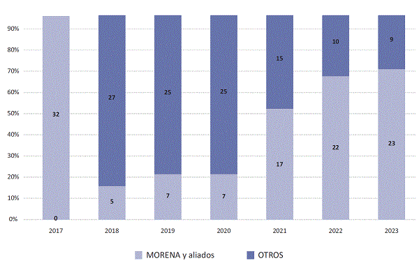 Si el 2018 marcó un giro rotundo en la política nacional, los años que siguieron dejaron en claro que esta reformulación también tenía lugar a nivel subnacional, con MORENA consiguiendo victorias en numerosas contiendas por gubernaturas. Esta transformación resultó más lenta al estar condicionada por un calendario electoral construido con el propósito de tener renovaciones escalonadas de los gobiernos estatales. Sin embargo, los datos dejan en claro la profundidad del cambio: si previo a 2018 las y los candidatos de MORENA no habían logrado ninguna victoria en elecciones estatales, para finales de 2023 la coalición que tiene a dicho partido como actor central controla 21 gubernaturas de 32 (y 2 otros gobernadores pertenecen a partidos que forman parte de la coalición oficialista). Este viraje en quien gobierna los estados mexicanos no solo ha generado transformaciones en la vida política local, sino que ha tenido efectos en la dinámica nacional. Desde el inicio del gobierno de López Obrador los gobernadores identificados con MORENA suelen actuar en bloque, realizando manifestaciones públicas de apoyo al presidente e incluso reformulando la lógica de actuación de la Conferencia Nacional de Gobernadores, que nació con el objetivo de ser un contrapoder a la figura presidencial pero ahora funciona como un grupo de presión para impulsar las iniciativas del jefe del ejecutivo federal.