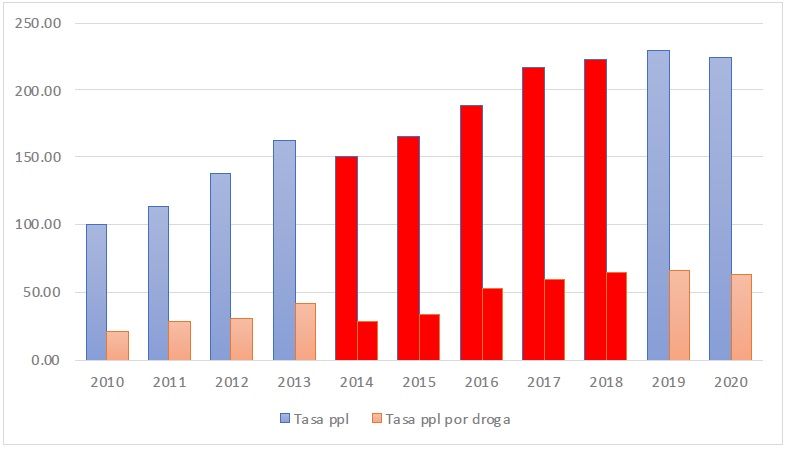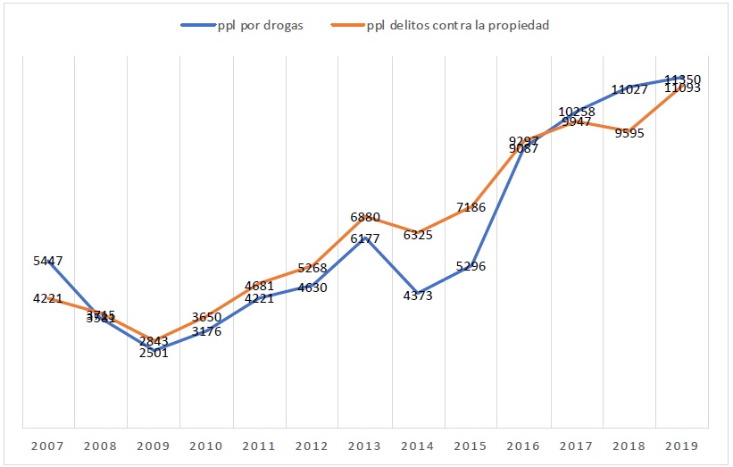 Producto de semejante lógica es que existe una estrecha relación entre los delitos contra la propiedad y los delitos contra las drogas que ha alimentado el stock penitenciario anual. En el año 2020, 5.5 por cada 10 prisioneros estuvieron recluidos por ese tipo de delitos en Ecuador y esto ha sido una constante desde la década de los ochenta. El encarcelamiento por drogas y delitos contra la propiedad son los que han alimentado la mayoría de población penitenciaria en el Ecuador (CONSEP, 1995; DNRS, 2005). Lo que ha cambiado es su frecuencia e intensidad, mas no el trasfondo.