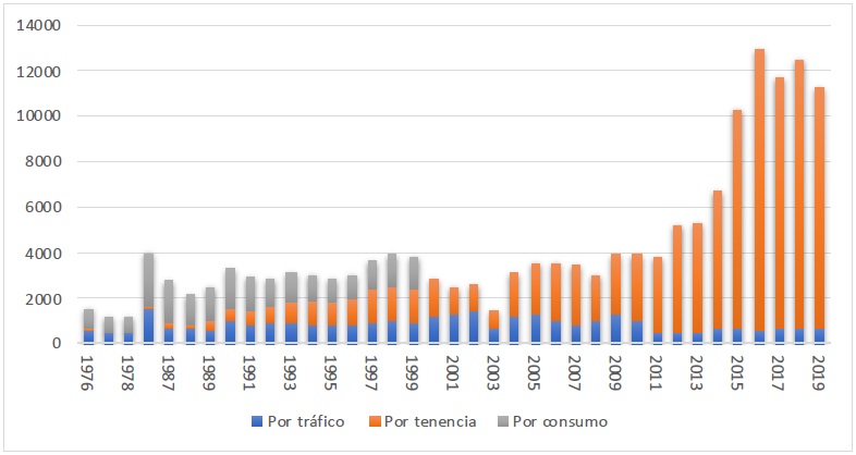 Pero la mira policial no ha sido homogénea. Desde 1976 hasta 1989, las detenciones por consumo eran mayoritarias frente al total de detenidos, lo que demuestra así la conexión con agendas puritanas hacia ese problema. En 2000 se dejó de producir información acerca de los detenidos por consumo en la Policía Nacional, presumiblemente a causa de la despenalización del consumo aprobada en 1997 en Ecuador. Pese a ello, a partir de la década de los noventa, las detenciones por “tenencia” empezaron a crecer y paulatinamente han ido copando el grueso de las detenciones a partir de la segunda mitad de la década del 2000 (actualmente representa más de 95% del total). Si bien legalmente la clasificación de “tenencia” es problemática en la legislación actual, la tenue diferenciación operativa entre tráfico y consumo ha hecho que la categoría “tenencia” englobara una cantidad importante de consumidores.